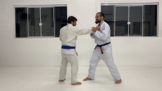 Como a mão correta está dominada, ele usa qualquer mão para pegar no kimono e se abre para um golpe, abaixo você vê o mesmo golpe em câmera lenta.